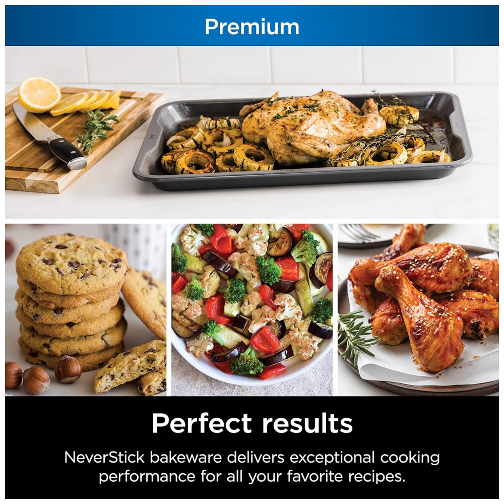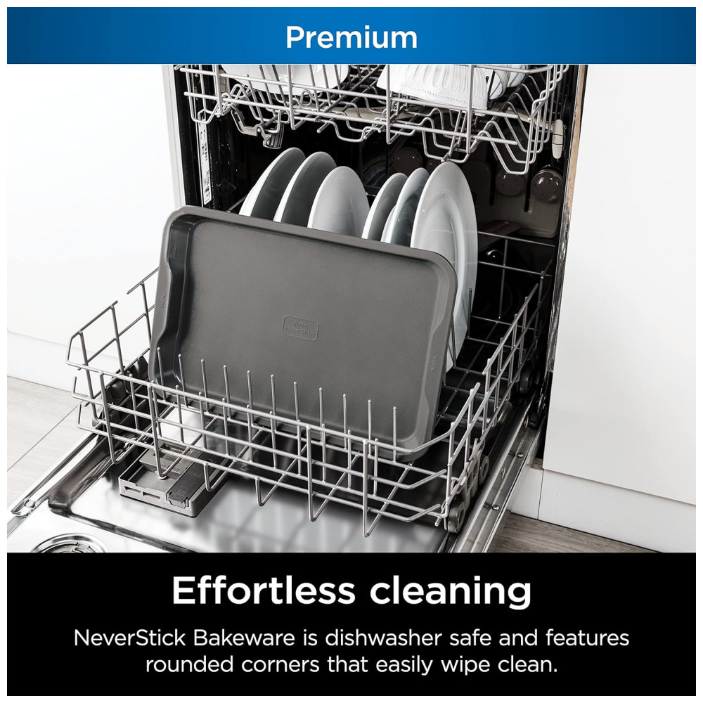 NEVERSTICK BAKEWARE: Projetada para liberar consistentemente os alimentos, permitindo que deslizem facilmente da assadeira.