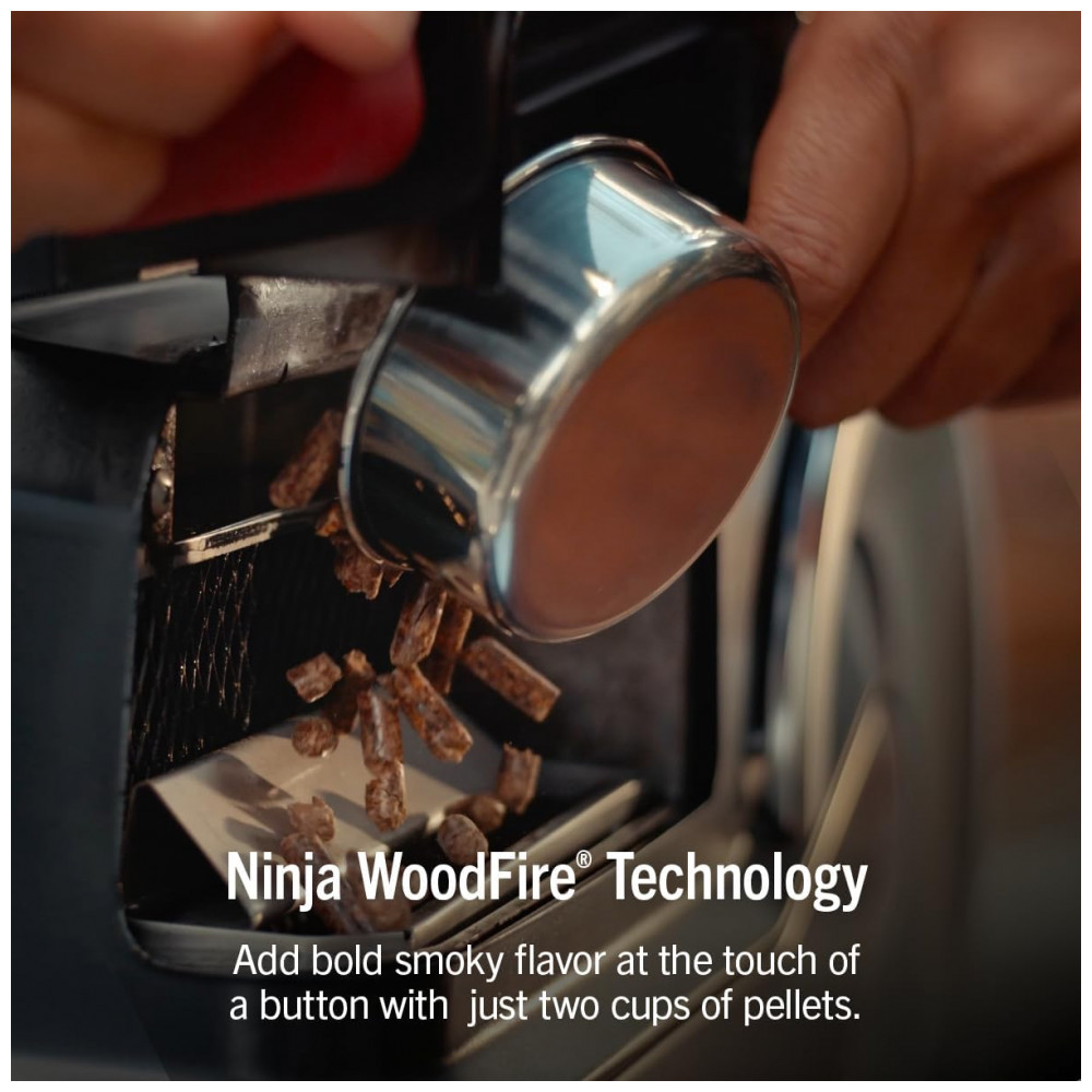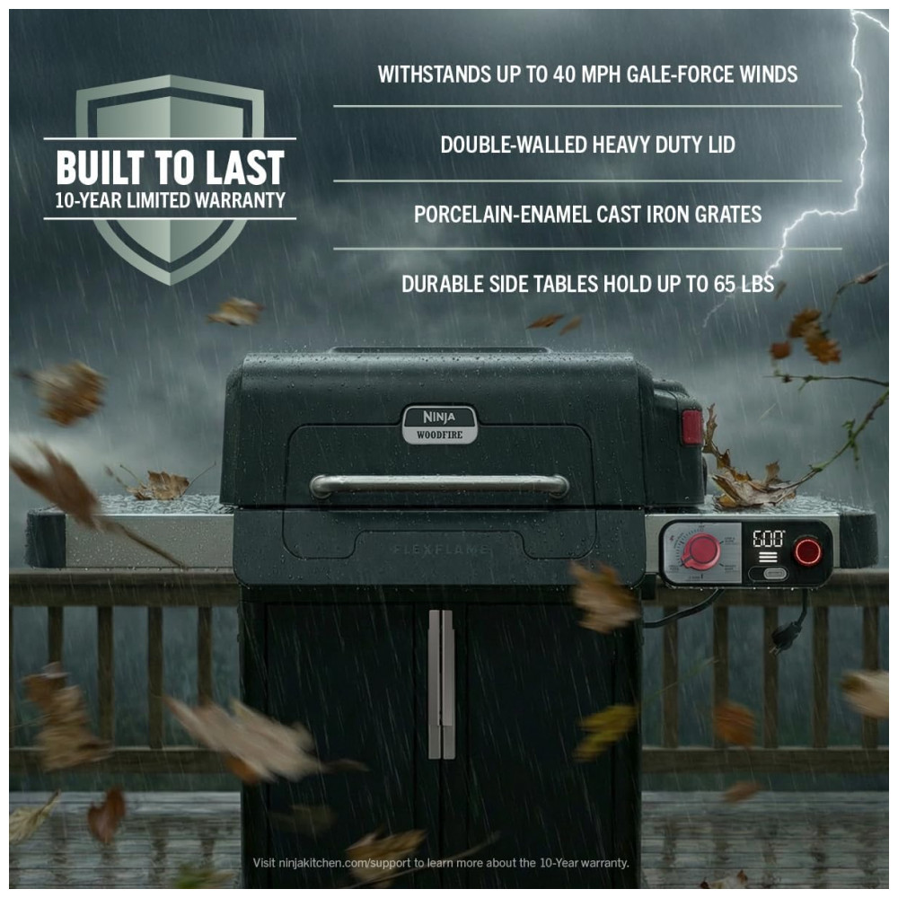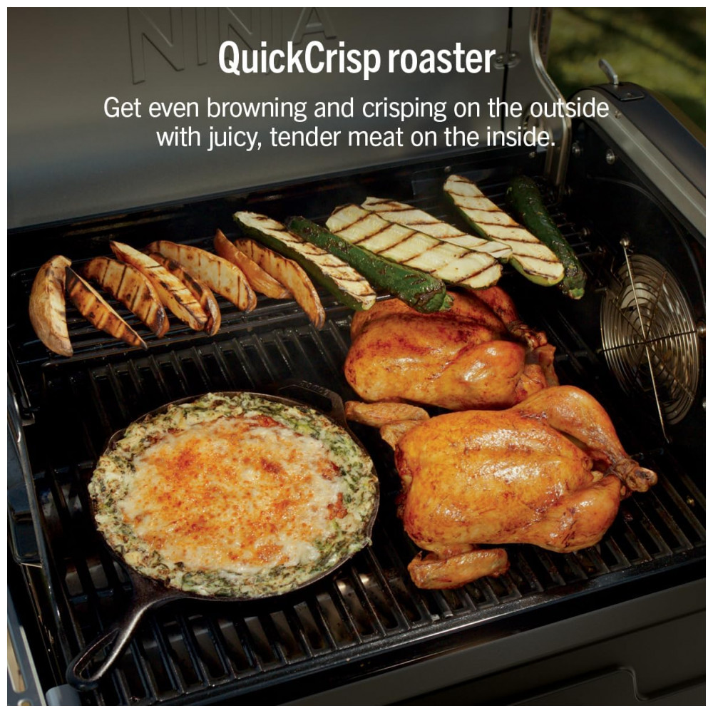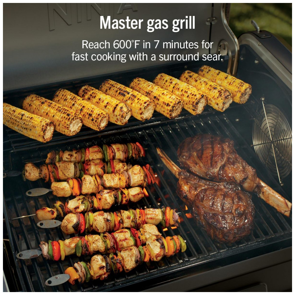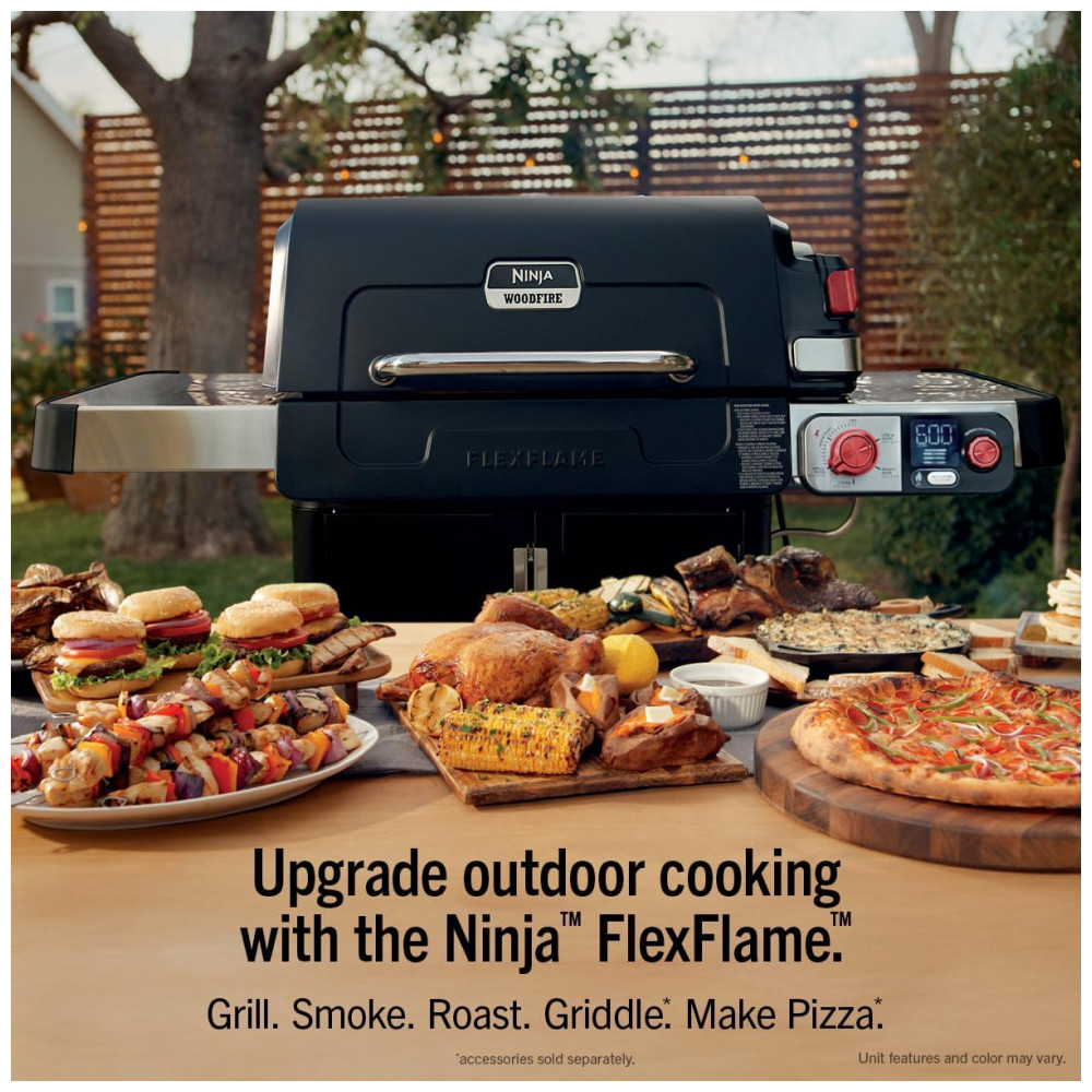 A churrasqueira Ninja FlexFlame é um sistema de cocção externa 5 em 1 que permite grelhar, defumar, assar, usar chapa griddle e preparar pizzas no mesmo equipamento. A combinação d