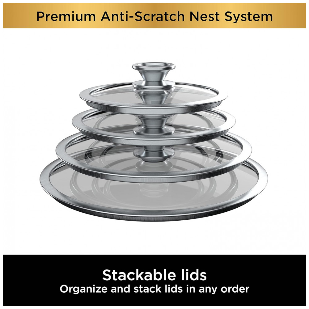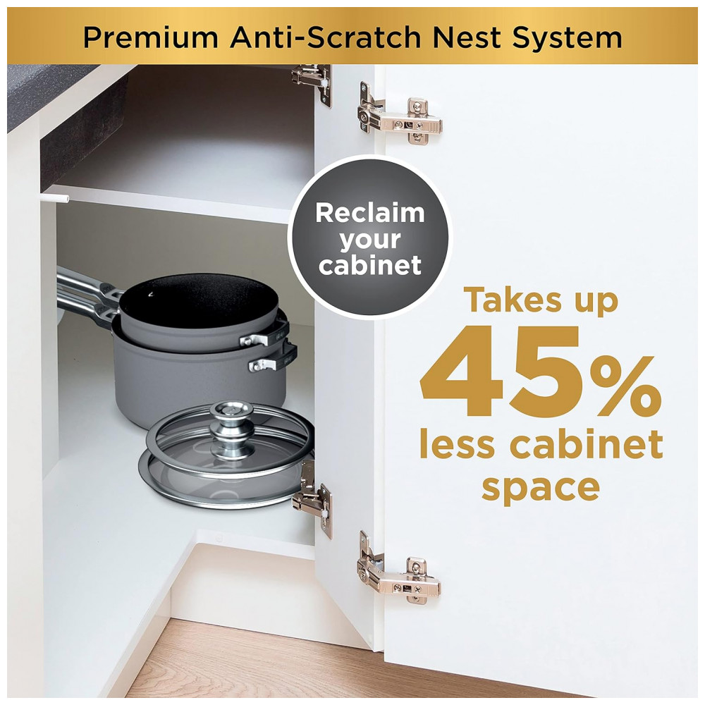 Com este sistema conveniente, vasos, panelas e tampas são facilmente empilhadas para ocupar 45 menos espaço no gabinete vs.