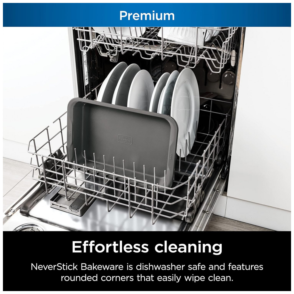 LIMPEZA FÁCIL A assadeira NeverStick é lavável na máquina de lavar louça e possui cantos arredondados que facilitam a limpeza.
