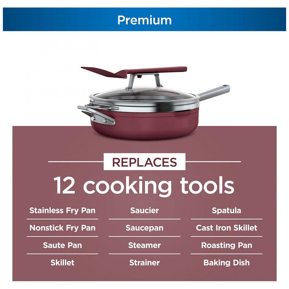 SUBSTITUIÇÕES 12 FERRAMENTAS DE COZINHA Sua nova panela de 4 quartos substitui uma frigideira de aço inoxidável, uma frigideira antiaderente, uma panela de refogar, uma panela, uma panela, um vapor, um filtro, espátula, frigideira de ferro fundido, assadeira e assadeira.