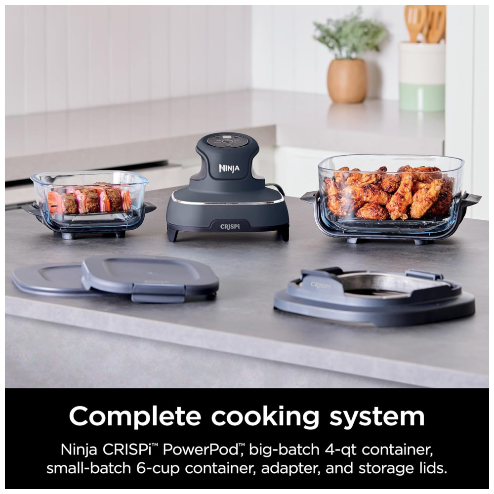 Fritadeira Elétrica Air Fryer Tudo em Um com 2 Recipientes de Vidro 3.7L e 1.4L e Tampas, 110V 1500W, Ninja Crispi FN101GY, Cinza: O Ninja Crispi é um sistema de cozimento portátil que oferece a potência de uma fritadeira de ar de tamanho normal em um design compacto.