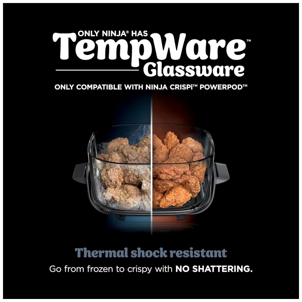 O sistema AllinOne inclui o Ninja Crispi PowerPod, recipientes de vidro TempWare de 3,73 litros e 1,4 litros e 2 tampas de armazenamento.