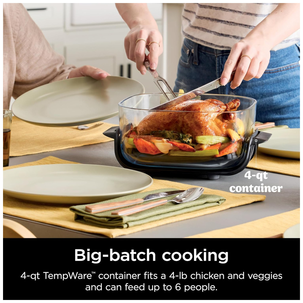 Os recipientes de pequenos e grandes lotes permitem que você cozinhe uma refeição individual em 7 minutos ou acomode 1,81 quilos de frango e vegetais.