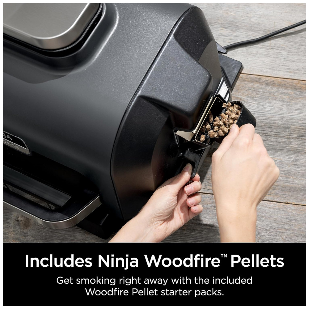 Grill Smoker Ninja Outdoor Woodfire Pro XL 4 em 1 Churrasqueira, Fumante, Air Fryer e Forno com Termômetro Embutido: A churrasqueira elétrica externa Ninja Woodfire Pro XL OG850 foi projetada para grelhar, defumar, assar e fritar por ar em ambientes externos, utilizando resistência elétrica combinada com pellets de madeira para geração de fumaça.