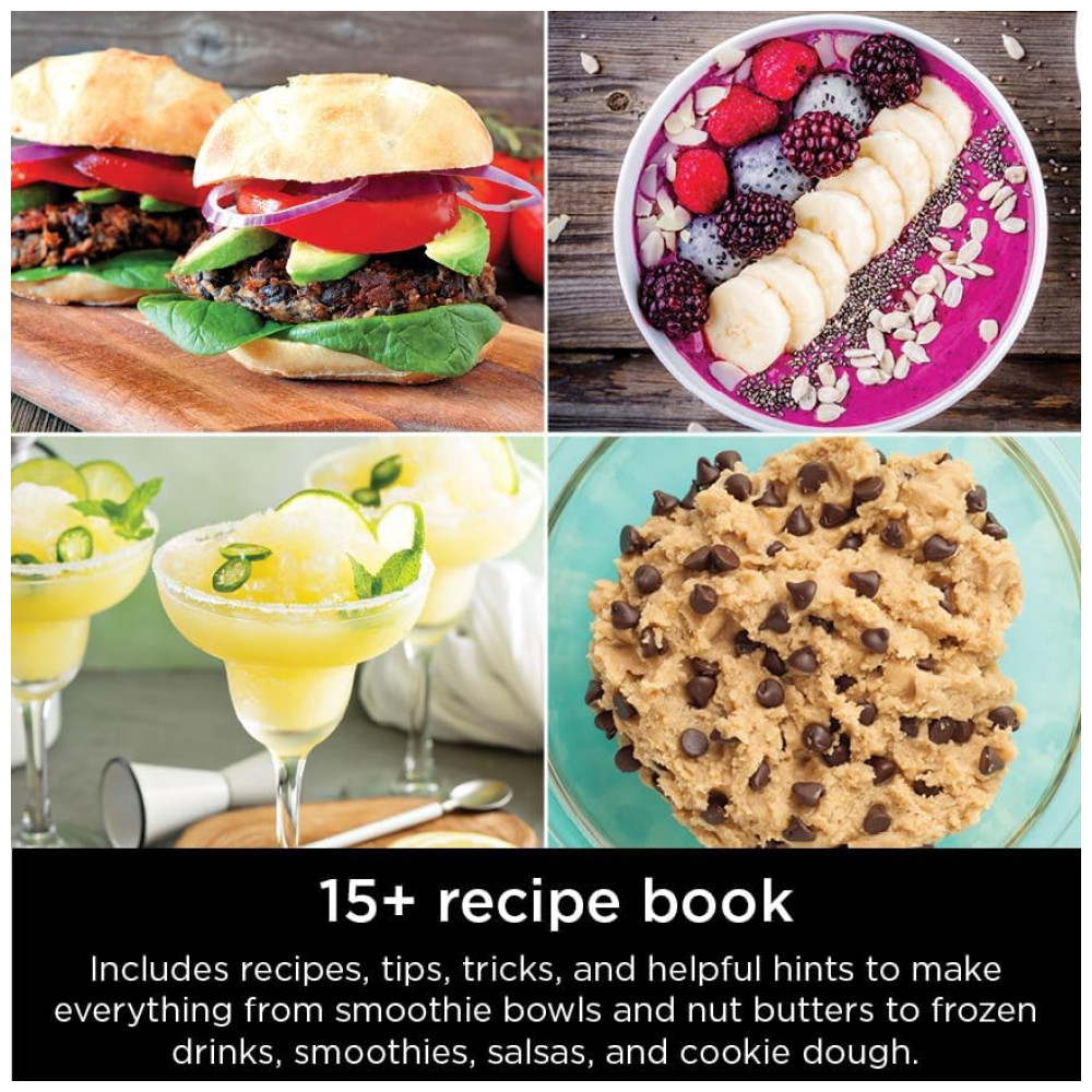 Inclui motor de potência densa de 1400 watts de pico, misturador elétrico de 2L e jarro de processamento líquido máximo de 64 onças com lâmina de trituração e corte total, lâmina de massa, escova de limpeza, 2 extração de nutrientes de 24 onças copo e bico Tampa, Criador de Smoothie Bowl de 414 mL com tampa de zenamento, lâmina de borda híbrida e guia de inspiração de receita