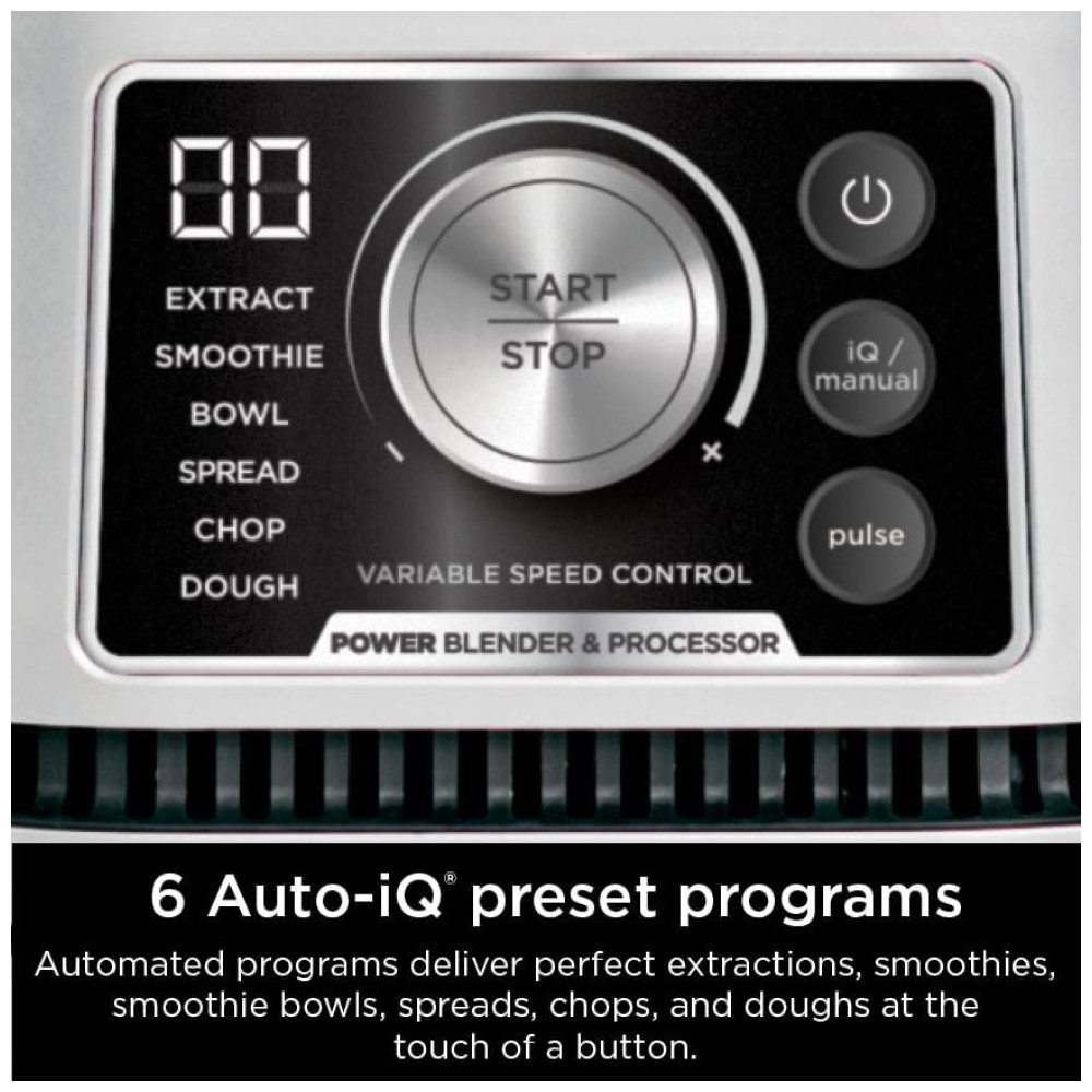 6 programas Auto iQ predefinidos para smoothies de um toque, extrações, tigelas, pastas, picar e massa.