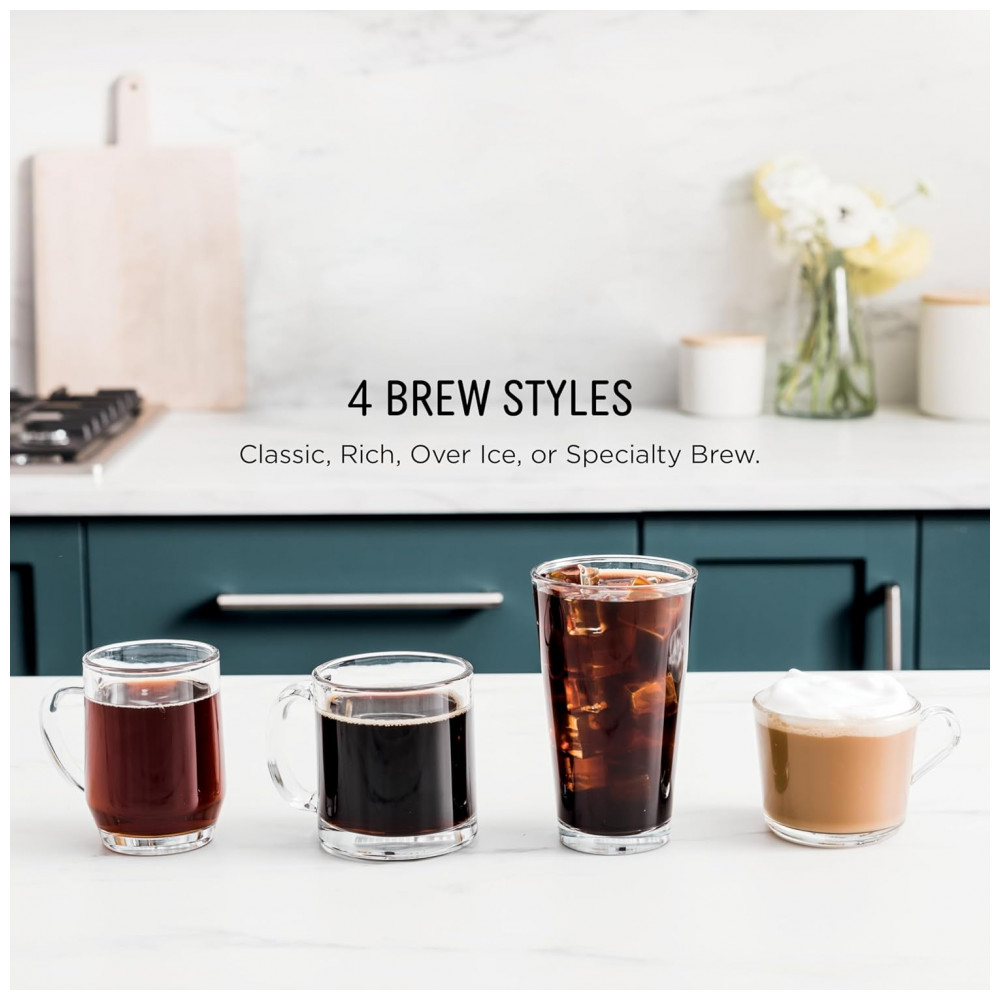 A Máquina de Café Ninja PB055AST prepara café individual com pods K Cup ou café moído, oferecendo quatro estilos de infusão Clássico, Rico, Sobre Gelo e Especial. Suporta tamanhos&