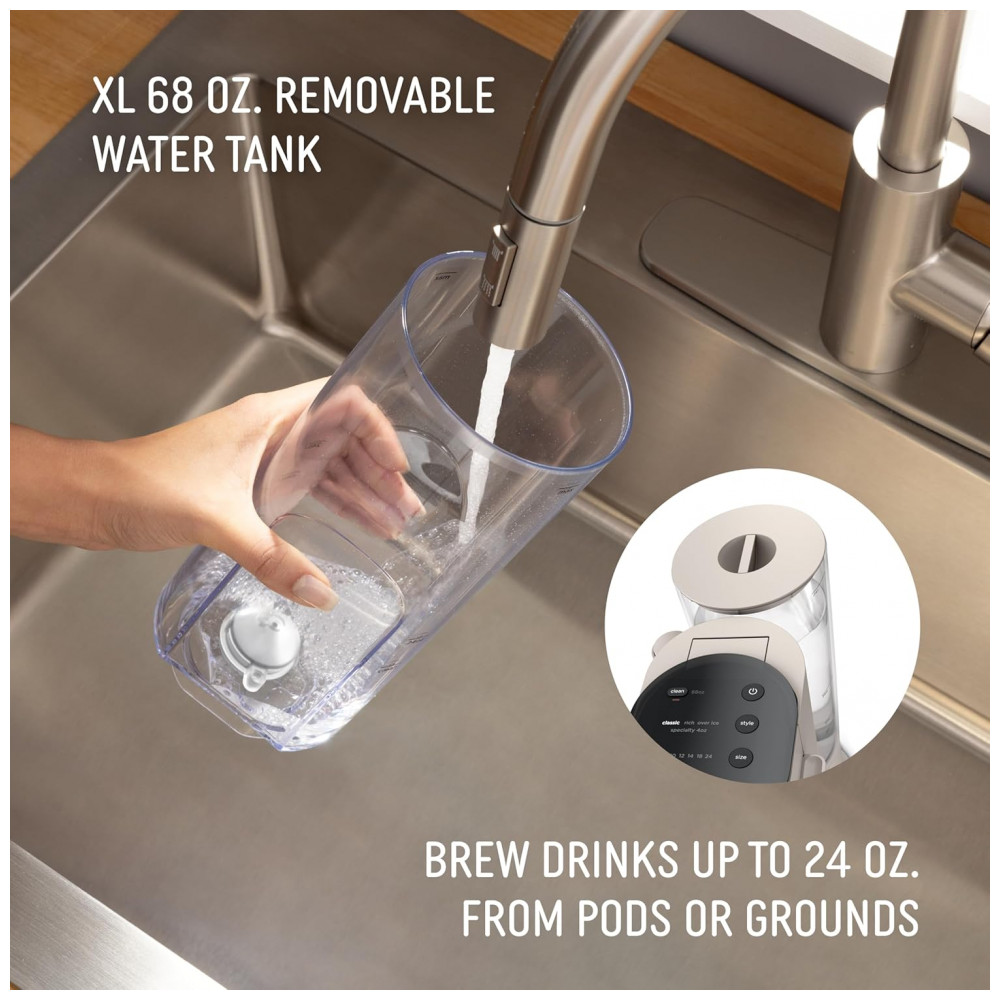 Suporta tamanhos de preparo com pods de 177, 237, 296 ou 355 mL, e com moído de 177, 237, 296, 355, 414, 532 ou 710 mL, proporcionando versatilidade superior a máquinas single serve convencionais.