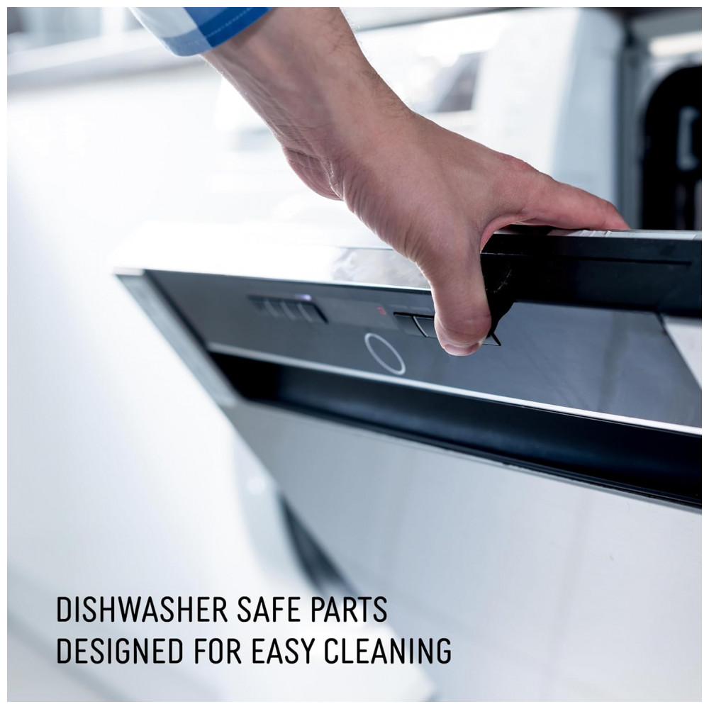 Equipada com frother dobrável integrado removível para espumar leite quente ou frio, opera em modo totalmente automático via botões com reservatório de água removível de 2 L para reabastecimento facilitado.