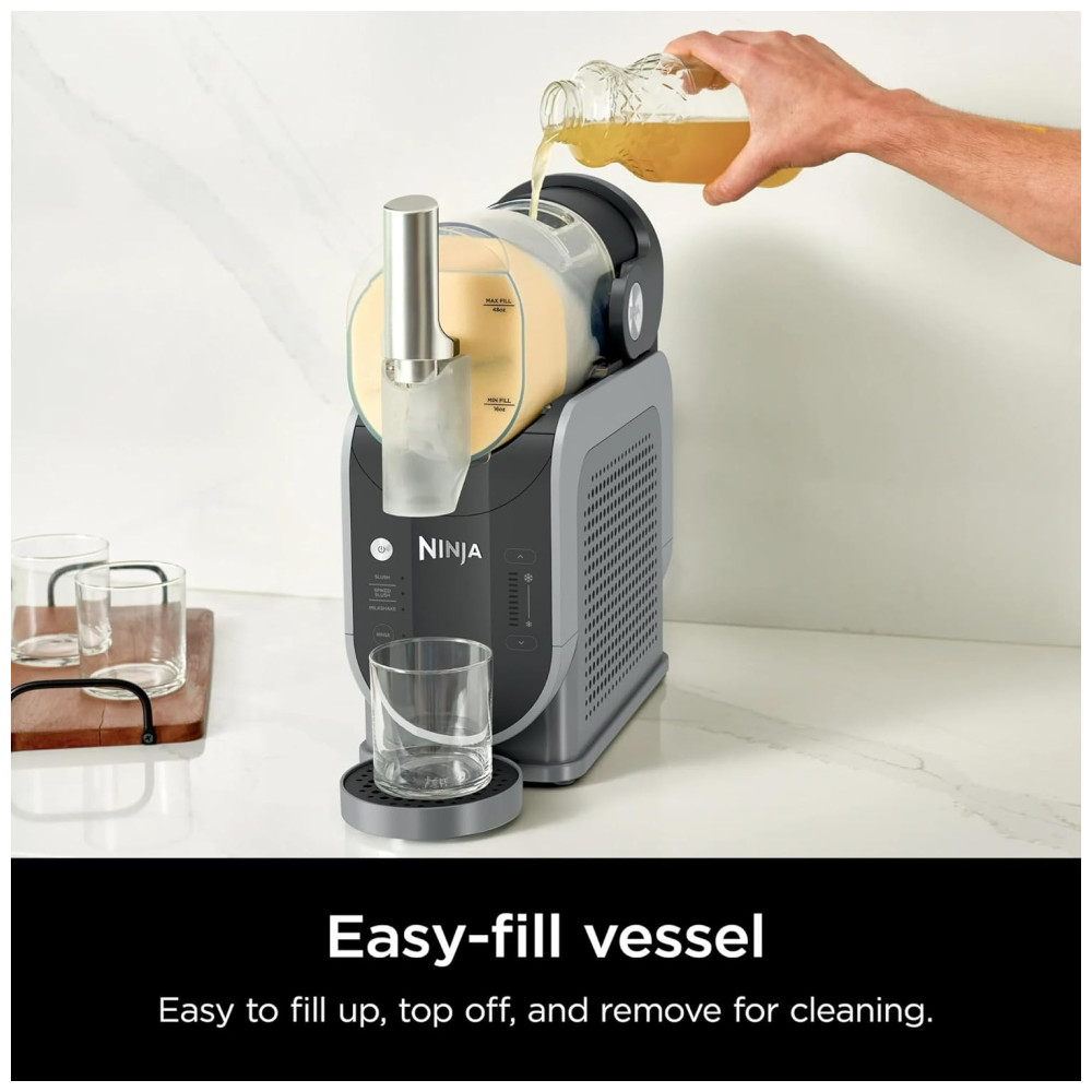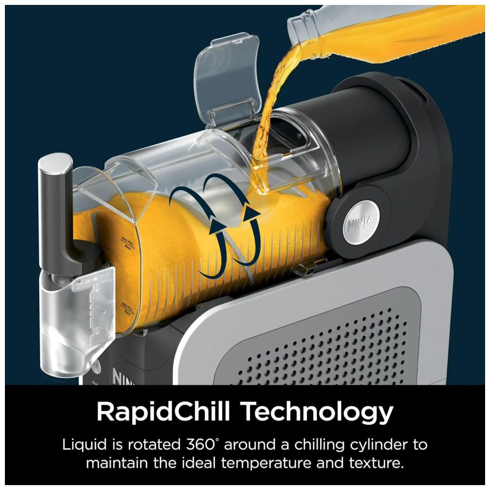 Máquina de Raspadinha Ninja, Máquina Profissional de Bebidas Congeladas, Possui 3 Configurações Pré Definidas.: Tecnologia Inovadora RapidChill Um sistema de duas partes gira o auger ao redor do cilindro de resfriamento, congelando líquidos rapidamente sem a necessidade de gelo, proporcionando delícias perfeitamente geladas.