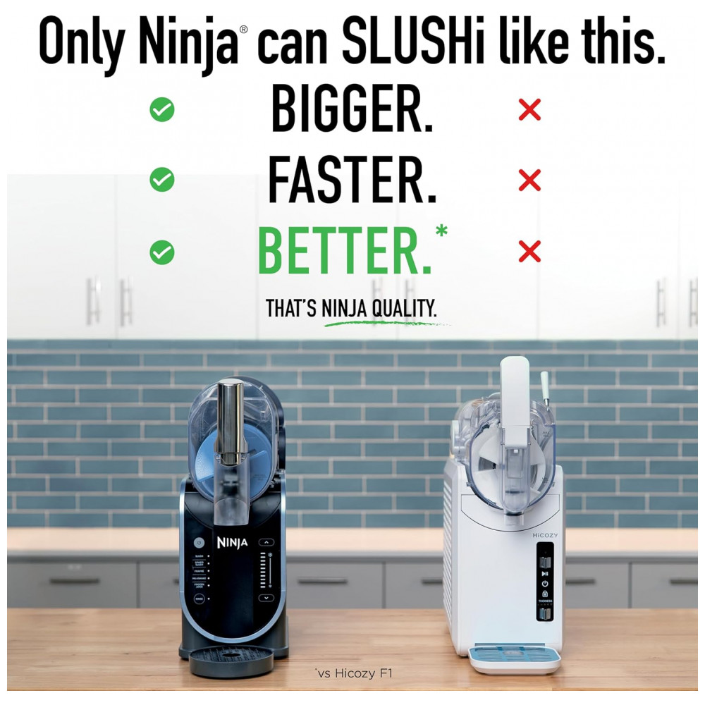 Operação simplificada com dispensação direta e estrutura compacta em preto com detalhes premium, modelo SLUSHI FS301 da SharkNinja.