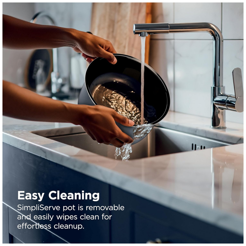 O interior da panela SimpliServe é revestido com uma superfície cerâmica antiaderente, 100 livre de PFAS, proporcionando uma limpeza rápida e prática, onde resíduos grudados são facilmente removidos.